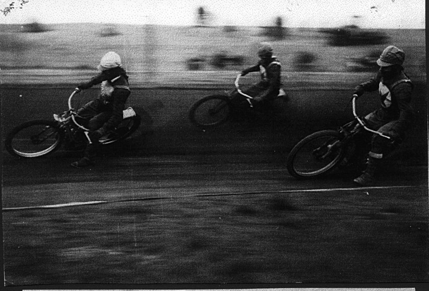 MONARCHS AT MOTHERWELL 1953 Scottish Speedway was on the slide after the boom post-war years by the time this photo was taken. Motherwell were probably the soundest of the Scottish promotions but the advent of television plus the crippling entertainment tax had the sport in trouble all over the country. There were still good riders around though and South African Roy Bester was a fine performer in his time with Monarchs. In this photo from Motherwell in 1953 he leads the way from Bluey Scott and Derek Close - two Eagles who happily are still with us! Photographer: Unknown. |