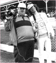 From 1990 we used a second camera for action filming from the centre green and for pit and trackside interviews. The Geoff Chandler interviews are almost as entertaining as the racing and countered the serious interview at the start of each meeting. This is a picture of Geoff Chandler and Charlie Balneaves. The 2nd. Camera Crew.