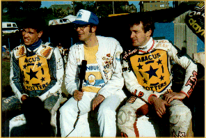 Please make cheques payable to EDINBURGH SPEEDWAY VIDEOS. Tel: 031—332—1127.1991 Powderhall Meetings DATE MEETING RATING 29/3 50:40 Glasgow (Ch) 9 5/4 52:38 Long Eaton (GC) 9* 19/4 58:32 Hungary 8 26/4 46:43 Glasgow (GC) 9* 10/5 45:45 Newcastle (GC) 9* 17/5 54:35 Rye House (SL) 9* 26/5 47:43 Sheffield (GC) 7* 31/5 H.E.A.T. Fours & Scot. Open 10* 7/6 45:45 Long Eaton (1(0) 7* 14/6 52:37 Middlesbrough (GC) 7* 23/6 53:37 Hackney (SL) 10* 28/6 51:39 Stoke (GC) 7* 5/7 49:41 Sheffield (SL) 9* 12/7 32:51 Arena-Essex (SL) 7* 26/7 57:33 Milton Keynes (SL) 8* 2/8 40:49 Glasgow (SC) 10* 9/8 Scottish Open 8* 16/8 51:39 Peterborough (SL) 9* 23/8 44:46 Newcastle (SL) 9* 30/8 46:44 Long Eaton (SL) 9* 6/9 54:36 Glasgow (SL) 9* 13/9 Scottish Riders’ Ch. 7* 20/9 62:28 Middlesbrough (SL) 7* 27/9 Brett Saunders Testimonial 8* 6/10 63:27 Stoke (SL) 7* 19/7 & 11/10 64:26 Exeter (SL) 7* 18/10 46:42 Berwick (Ch) 6* *=THREE cameras used 2 for racing, 1 for interviews. SPECIAL OFFER: The WHOLE season on 9 tapes (3 meetings per tape) for just £100! ALSO: THE BRETT SAUNDERS STORY (£l0) - 2½ hours. ALSO: THE MONARCHS OF ‘51 (£l0) - unique film of Jack Young, Dick Campbell etc. in action and informal (43 mins.) ALSO: 1991 POWDERHALL HIGHLIGHTS (£10) - the best moments of the year (2¾ hours)Geoff Chandler should be interviewing 'Bootsy Monaghan and Gary Stead. Instead they appear to be watching the racing.