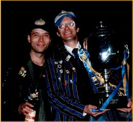 Please make cheques payable to EDINBURGH SPEEDWAY VIDEOS. Tel: 031—332—1127. On a single tape we can generally fit 4 matches of average length, and the reason we make the matches so cheap is to encourage people to take compilation tapes, giving good value for money. PRICES: 1 MEETING £10, 2 MEETINGS £14, 3 MEETINGS £17, 4 MEETINGS £20 FULL SEASONS £100, OTHER DEALS ALWAYS NEGOTIABLE!1997 Armadale Meetings Date Meeting Rating 4/4 43:47 Glasgow (Ch) 6 11/4 47:43 Hull (KO) 8 18/4 51:39 Stoke (KO) 8 25/4 47:43 Newcastle (KO) 8 2/5 51:39 Berwick (KO) 8 9/5 55:35 Sheffield (LC) 7 16/5 50:40 Glasgow (LC) 7 23/5 48:42 Stoke (PL) 8 30/5 53:36 Skegness (PL) 7 6/6 55:35 Newport (PL) 8 20/6 Four TT 8 (Newcastle, Berwick & Glasgow) 27/6 45:45 Long Eaton (PL) 8 4/7 51:39 Reading (LC) 8 11/7 54:36 Arena-Essex (PL) 8 18/7 54:36 Exeter (PL) 8 25/7 58:32 Oxford (PL) 8 1/8 64:26 Sheffield (PL) 7 8/8 SCOTTISH OPEN 7 15/8 46:44 Berwick (PL) 9 22/8 53:37 Glasgow (PL) 7 30/8 47:43 Oxford 9 (KO Cup Final) 5/9 59:31 Hull (PL) 7 12/9 46:44 Reading (PL) 8 19/9 44:46 Newcastle (PL) 9 28/9 49:41 Glasgow (SC) 8 3/10 49:40 Glasgow (YS) 8 10/10 Scottish Champs 8 24/10 48:42 Long Eaton (YS) 7CUP FINAL - both legs, Oxford and Edinburgh - £12! Geoff and Cameraman Derek Payne celebrating the KO Cup win against Oxford. HIGHLIGHTS OF 1997 tape - £14
